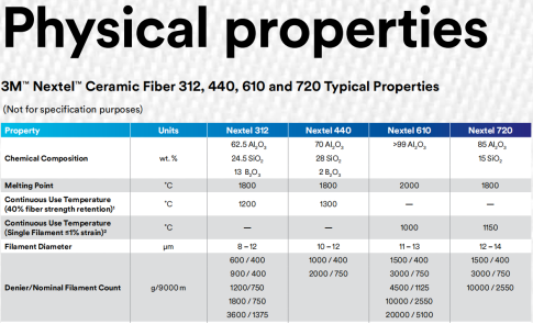 3M™Nextel™陶瓷纤维312、440、610和720的部分技术参数。根据3M官网描述,我们可以大概分辨这些不同产品的应用方向:高温纤维Nextel陶瓷纤维312和440在转化为织物、胶带和套管后,可在航空航天、工业、汽车、电气和石化市场用作隔热罩、窗帘、衬里、绝缘材料、毯子和密封件。结构纤维Nextel陶瓷纤维610和720用于陶瓷、聚合物和金属基复合材料。Nextel陶瓷纤维610以其出色的单丝拉伸性能而著称。Nextel陶瓷纤维720因其高抗蠕变性而被用于陶瓷基复合材料中(由添加了SiO₂,形成了莫来石相的,减少了晶界滑动使得Nextel720比Nextel610具有更高的蠕变阻力,在更高的温度下具有更好的强度保留)。