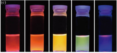 (d)红色发光的硅量子点,分散在溶液中 (e)上述d的电子显微镜图像