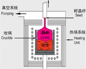 提拉法是先将氧化铝原料加热至熔点使之熔化形成熔体,再利用一单晶棒作为晶种(Seed)降下高度使下面端面逐渐接触到熔体表面,在晶种与熔体的固液界面上会有一定的温度差。由于温度梯度的作用,熔体开始在晶种表面凝固并生长和晶种相同晶体结构的蓝宝石单晶。晶种同时以极为缓慢的速度向上拉升,并伴随着一定的旋转,熔体逐渐结晶于晶种与熔体之间的固液界面上,最后生长成蓝宝石单晶晶棒。