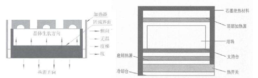温度梯度法(Temperature gradient technique,TGT)是实现用定向籽晶来诱导蓝宝石单晶生长,熔体沿着籽晶晶体结构的原子排列结晶长出蓝宝石晶体。温度梯度法长晶装置包括隔热板、热元件、坩埚、石墨电极以及冷却水管,籽晶槽位于坩埚底部,温场由石墨发热体和冷却装置共同提供。