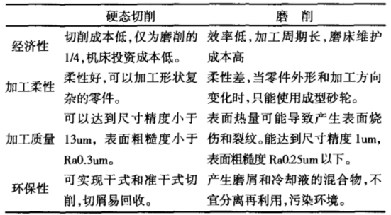 对于高硬度钢材,传统的加工方法主要是在退火的条件下对工件进行粗加工,再经过热处理,最后通过磨削完成工件加工。而硬态切削技术不同于传统的加工方法,它比传统的加工步骤更少,通过消除第二热处理节约加工时间,硬态加工工艺提供了更高的灵活性,增加了材料的去除率,甚至可以实现干式加工。由于超硬材料刀具的出现及数控机床等加工设备精度的提高,采用硬态切削代替磨削完成零件最终加工-以车代磨,已成为一种新的重要的精加工途径。如下是硬态切削与磨削的工艺对比。
